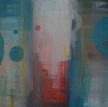 Abstract painting showing aspects of my life. Me holding a baby is symbolic of the childcare work that I did at the time, the boys are two friends of mine debating and discussing the existance of God.